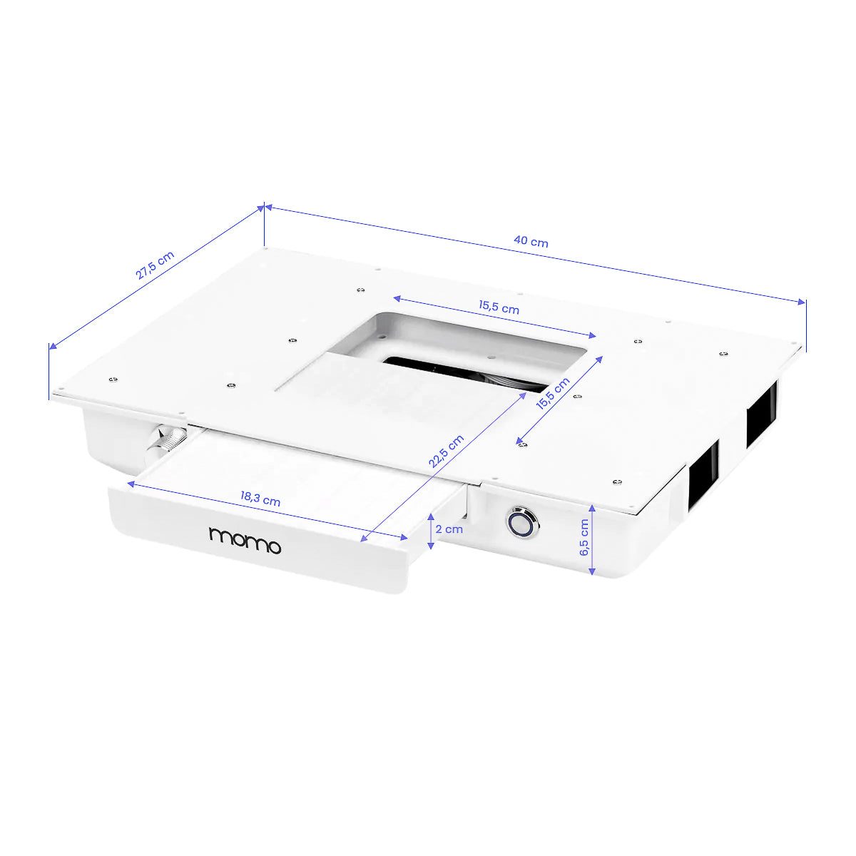 The Momo J-02 cassette dust collector built into the countertop significantly improves the comfort and hygiene of work, effectively removing dust generated during beauty treatments, such as manicures. Thanks to this device, the air in the salon remains clean and the workplace free from pollution, which increases the safety of both the beautician and clients. The dust collector is easy to use and maintain, which additionally enhances its functionality. Regular cleaning and filter replacement ensure consistently high absorption efficiency. It is possible to purchase additional replacement filters (SKU 123581).
